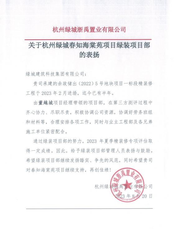 近日,绿城建筑科技集团浙西区域公司获得华润置地杭珹未来中心项目颁发的“先进单位”称号,以及杭州春知海棠苑项目书面表扬。