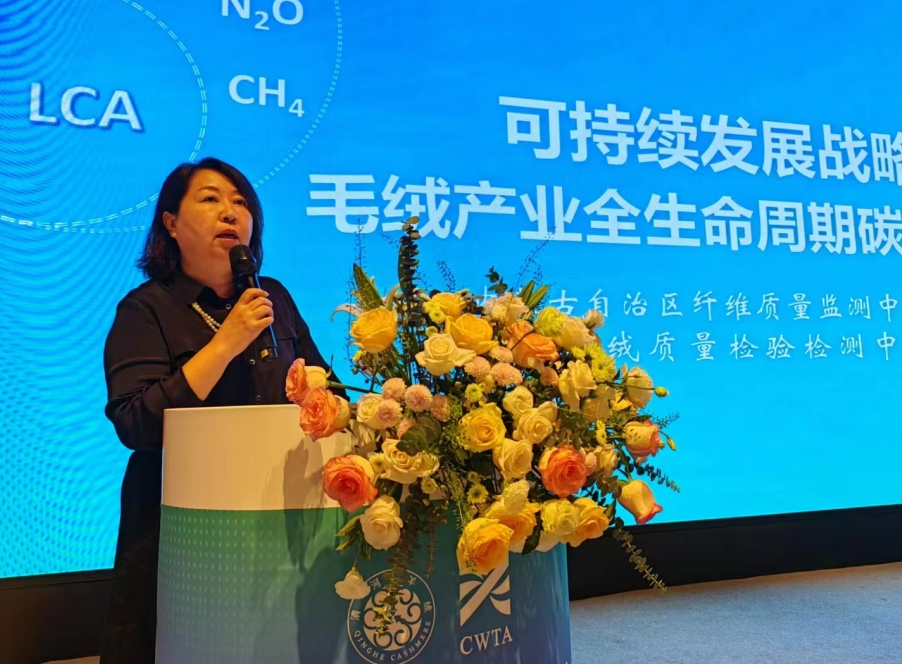 内蒙古自治区纤维质量监测中心主任王莉对可持续发展战略背景下毛绒产业全生命周期碳足迹研究的必要性作了阐述,并介绍了从原料获得、产品生产、销售、使用维护、废弃的纺织行业全生命周期碳足迹过程,同时从研究方向、成果应用等多维度描绘了毛绒产业链全生命周期碳足迹研究发展的愿景。