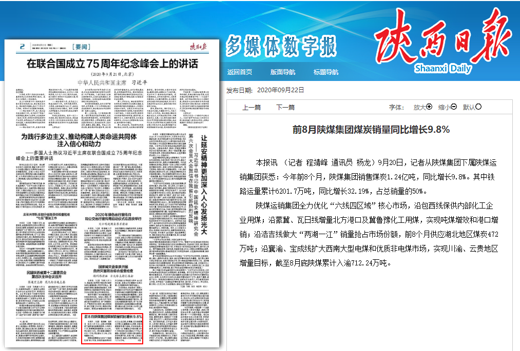 陕西日报:前8月陕煤集团煤炭销量同比增长9.8%