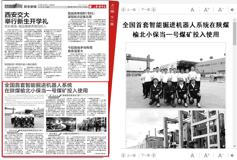 7月26日,国内首套智能掘进机器人系统在小保当公司进行工业性试验,正式进行地面组装。8月11日,地面联合试运转成功。8月20日,进行整装入井安装调试。9月8日,完成设备五大功能调试,投入使用。整个过程,不到两个月的时间。