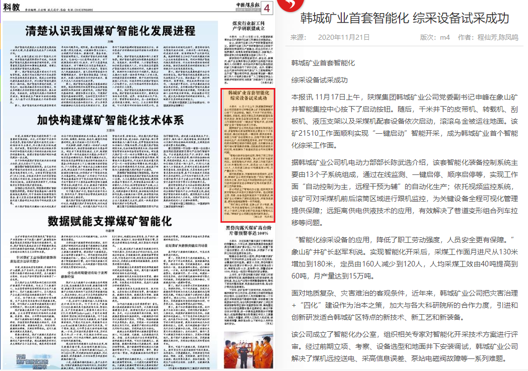 “我们将以点带面,在象山矿井3号煤、桑树坪二号井实施智能化工作面建设。到2022年,6个综采工作面全部升级改造为智能化工作面。”韩城矿业公司副总经理刘新民表示。(程仙芳 陈凤鸣)