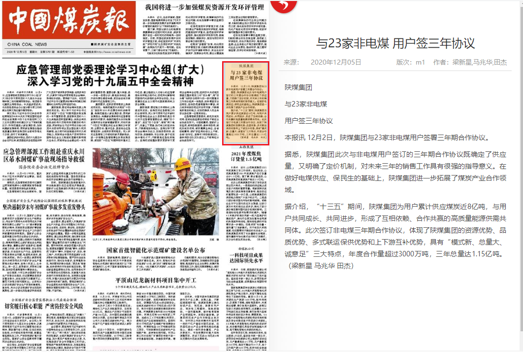 本报讯 12月2日,陕煤集团与23家非电煤用户签署三年期合作协议。