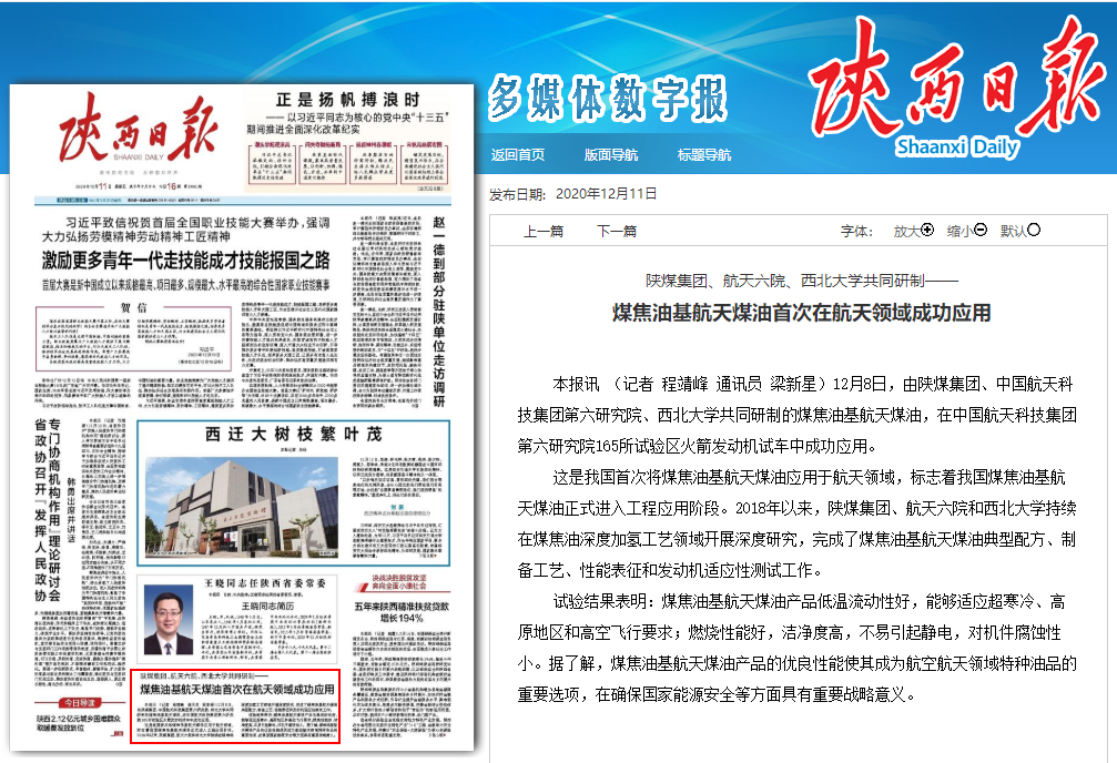 这是我国首次将煤焦油基航天煤油应用于航天领域,标志着我国煤焦油基航天煤油正式进入工程应用阶段。2018年以来,陕煤集团、航天六院和西北大学持续在煤焦油深度加氢工艺领域开展深度研究,完成了煤焦油基航天煤油典型配方、制备工艺、性能表征和发动机适应性测试工作。