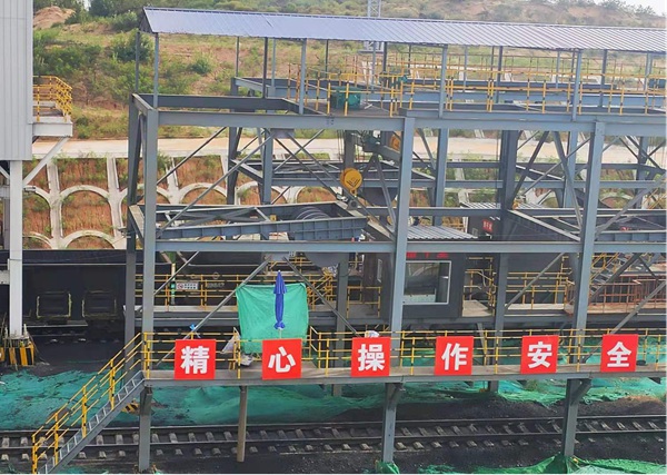 新建成的智能火车运销系统,实现了一键启停、自动装车、无人值守的功能,以智能云端、远程监测控制的智慧化装车系统实现了高效智慧装车,火车装车系统1小时可实现5000吨的装车量,单节车皮(C70)时间控制在47秒/节以内,(C80)时间控制在54秒/节以内,整列车60节仅用时1小时就可完成。