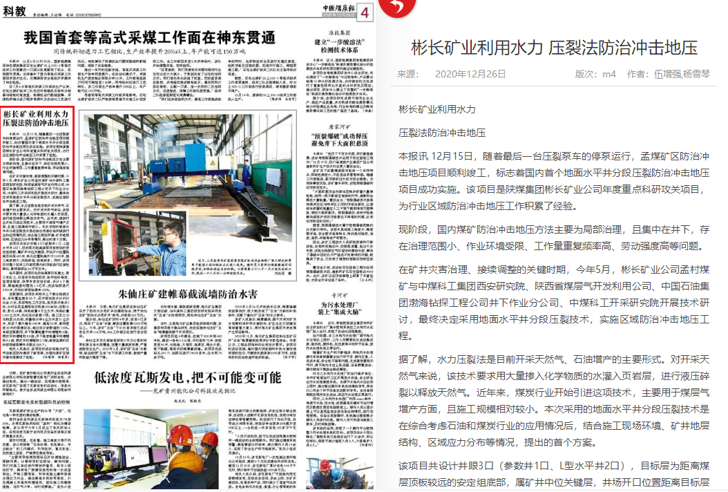 本报讯 12月15日,随着最后一台压裂泵车的停泵运行,孟煤矿区防治冲击地压项目顺利竣工,标志着国内首个地面水平井分段压裂防治冲击地压项目成功实施。该项目是陕煤集团彬长矿业公司年度重点科研攻关项目,为行业区域防治冲击地压工作积累了经验。