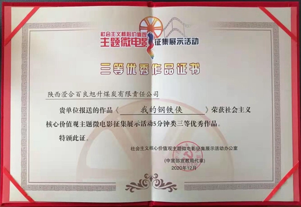 近日,由中宣部宣教局、中央网信办网络新闻信息传播局、中央新闻纪录电影制片厂(集团)联合主办的第四届社会主义核心价值观主题微电影(微视频)征集展示活动优秀作品评选结果揭晓。由澄合矿业百良公司报送的微电影《我的钢铁侠》荣获5分钟类三等优秀作品,系陕煤集团唯一获奖作品。