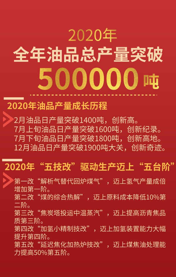 新年传喜讯,新年送新礼。截至2020年12月31日,陕西东鑫垣化工有限责任公司全年油品产量达到500110吨,比2019年多生产171480吨,增长了52.18%;比2018年多产246923吨,增长了97.53%。