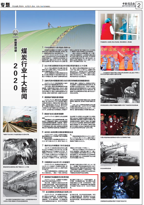 2020年煤炭行业十大新闻《我国煤矿快掘进技术取得突破》:2020年11月26日,全国煤矿快速掘进现场交流会在陕西省榆林市召开。据全国煤矿快速掘进现场交流会消息,目前全国已建成煤矿智能化掘进工作面123个,实现环境感知、自主导航、自动截割等功能。在智能快速掘进方面,陕煤集团榆北煤业曹家滩公司创造了单巷91米/日、2020米/月的记录。