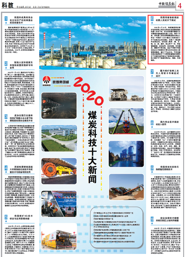 2020年煤炭科技十大新闻《我国首套智能掘进机器人完成井下调试》:2020年6月23日,陕煤集团西安煤矿机械有限公司自主研发的首套智能掘进机器人系统下线,成为目前国内智能化水平最高的智能掘进机器人系统。同年9月底,该机器人系统在陕煤集团榆北煤业小保当一号煤矿112204掘进工作面完成了井下安装及各系统调试,实现了一键启停和远程监控。