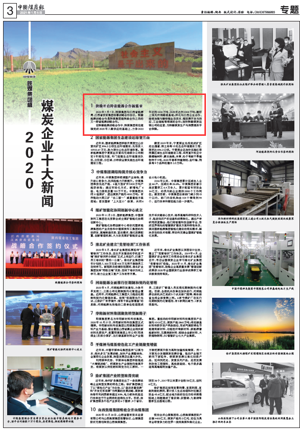 2020年煤炭企业十大新闻《陕赣开启跨省能源合作新篇章》:2020年7月7日,陕煤集团与江西省能源局、江西省投资集团签署战略合作协议。在陕赣能源战略合作中,陕煤集团将在超额完成2020年入赣供应的基础上,力争2022年达到1000万吨、2025年达到2000万吨;建好上饶光伏领跑者基地;深化与江西企业合作,继续加强与赣锋锂业在资本、锂资源开发与供应、工业储能等领域的合作;加快陕赣煤炭运销公司的运营,为陕赣煤炭生产与消费提供平台保障。