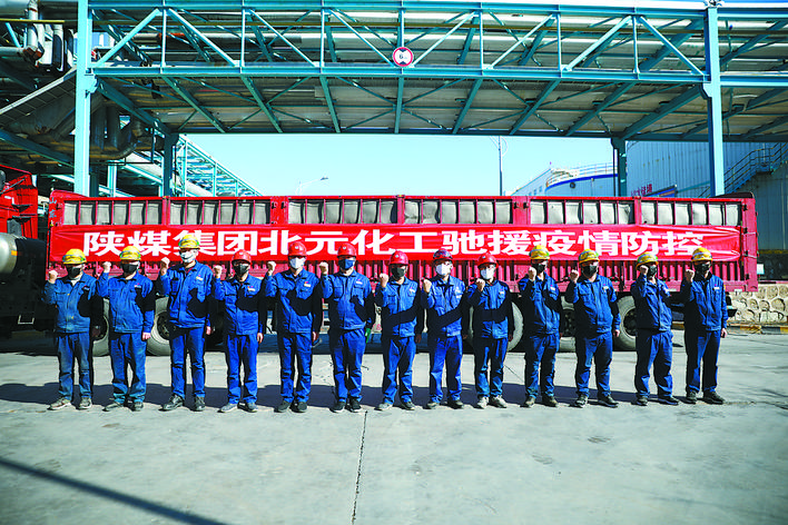 陕煤集团北元化工公司向社会捐赠次氯酸钠消毒液。