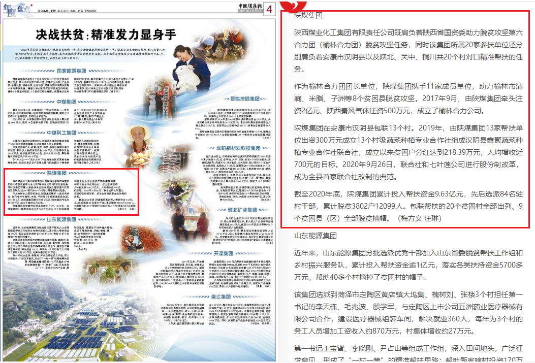 陕西煤业化工集团有限责任公司既肩负着陕西省国资委助力脱贫攻坚第六合力团(榆林合力团)脱贫攻坚任务,同时该集团所属20家参扶单位还分别肩负着安康市汉阴县以及陕北、关中、铜川共20个村对口精准帮扶的任务。