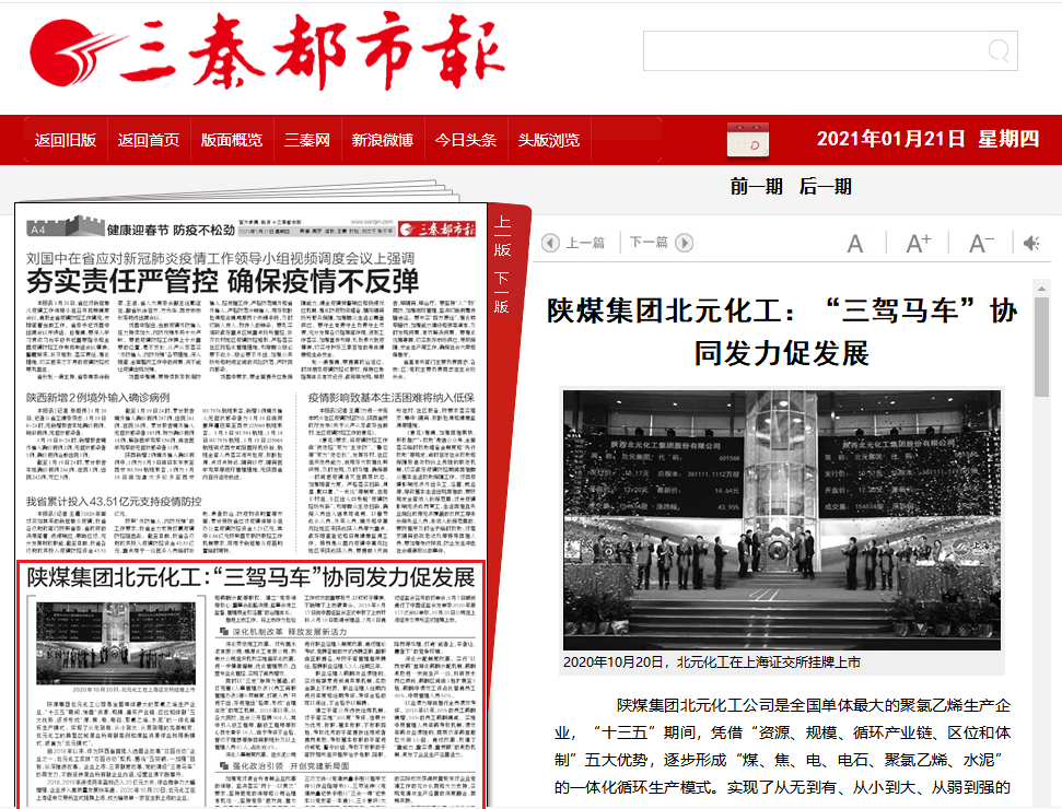 2018、2019年连续两年盈利迈入20亿元大关,综合竞争力大幅增强,企业步入高质量发展快车道。2020年10月20日,北元化工在上海证券交易所正式挂牌上市,成为榆林第一家在主板上市的企业。
