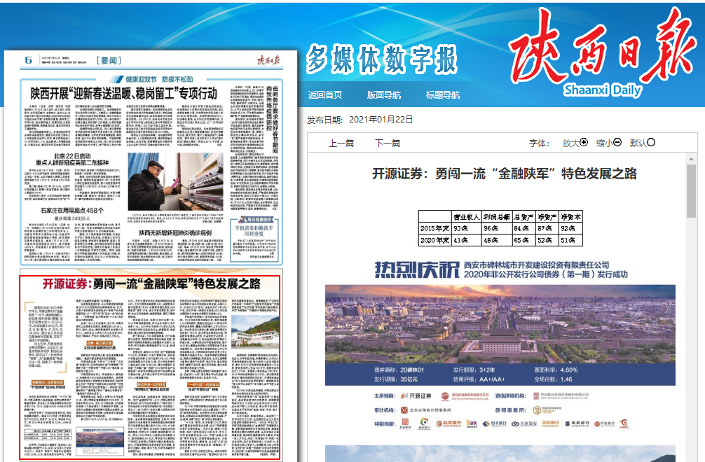为陕西优质企业提供多维度的资本运作服务。省内债券承销稳居榜首,近四年,开源证券作为主承销商发行债券规模占陕西债券发行总规模的比重分别为29%、47%、47%和37%。“十三五”期间,共为省内28家企业完成债券融资,共发行47只债券,融资规模881亿元。其中,2020年共为13家陕企发行债券18只,融资规模达309亿元,碑林城开公募债创下西部区县首期公司债发行最大规模纪录。此外,开源证券响应省委省政府有关部署,积极对口榆林、商洛、铜川三地,协助市县融资平台转型升级。