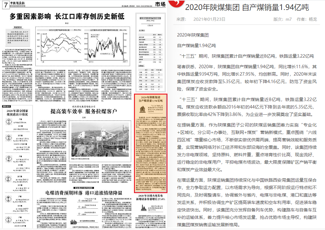 笔者获悉,2020年,陕煤集团自产煤销量1.94亿吨,同比增长11.6%,其中铁路运量9394万吨,同比增长27.95%,均创新高。同时,2020年末该集团煤炭应收货款降至5.35亿元,较年初下降4.16亿元,防范了资金风险,保障了资金安全。