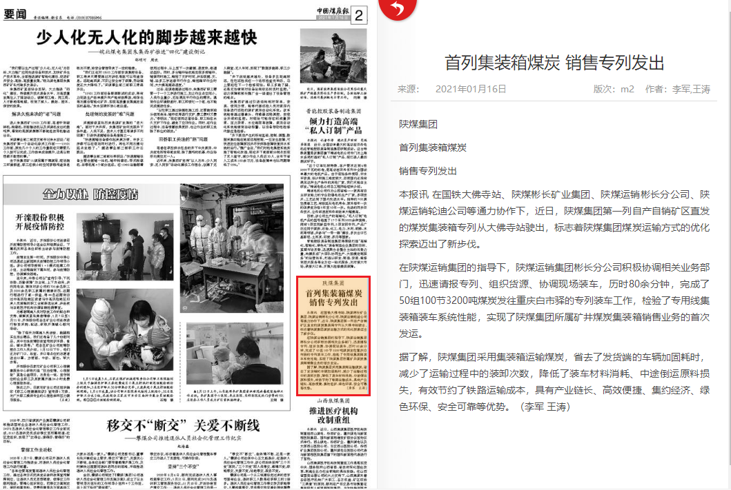 本报讯 在国铁大佛寺站、陕煤彬长矿业集团、陕煤运销彬长分公司、陕煤运销轮迪公司等通力协作下,近日,陕煤集团第一列自产自销矿区直发的煤炭集装箱专列从大佛寺站驶出,标志着陕煤集团煤炭运输方式的优化探索迈出了新步伐。