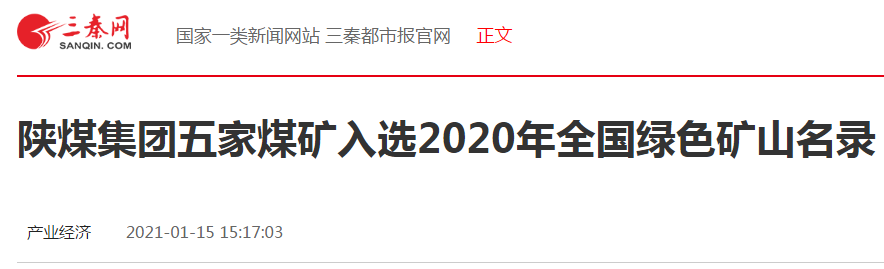 三秦都市报-三秦网讯(钱锴 王玉 记者 王媚)近日,自然资源部对外公布2020年度纳入全国绿色矿山名录的矿山名单,陕煤集团陕北矿业公司红柳林煤矿、张家峁煤矿、韩家湾煤矿、孙家岔龙华煤矿,澄合矿业公司安阳煤矿5家煤矿成功入选。