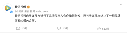 吴亦凡事件爆出后,腾讯手游王者荣耀在19日午间删除了吴亦凡的代言人官宣微博,并在微博评论中表示,“与吴亦凡的品牌合作关系已经于2021年上半年结束,未续约。”此外,当日腾讯视频也宣布与吴亦凡的合作撤销。