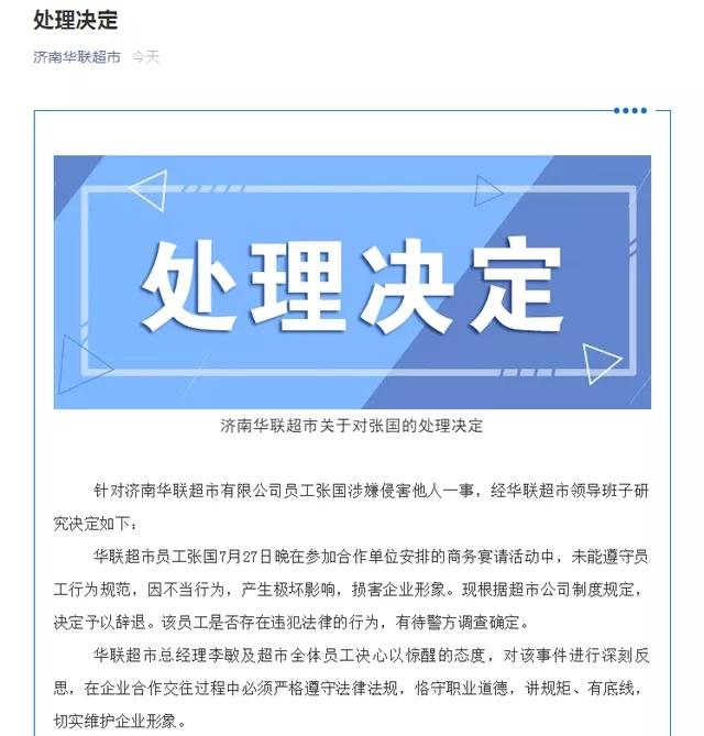 公告表示,华联超市员工张国7月27日晚在参加合作单位安排的商务宴请活动中,未能遵守员工行为规范,因不当行为,产生极坏影响,损害企业形象。现根据超市公司制度规定,决定予以辞退。同时,公司将进行深刻反思 ,恪守职业道德,维护企业形象。