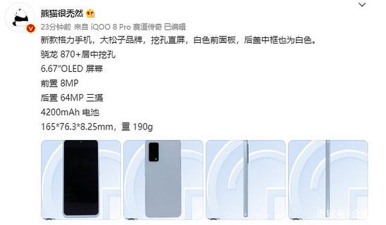 【企迪网讯】最近,格力推出一款新手机,核心搭载骁龙870处理器,采用挖孔直屏,通体为白。这款手机定位为中端机型,预计售价在2500元至3000元之间。