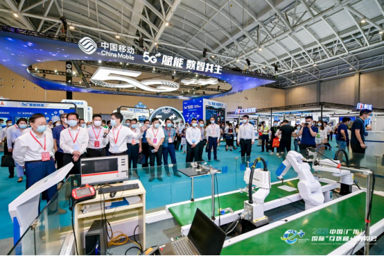 振威国际会展集团董事长张学山(前排左三)陪同工业和信息化部原部长、中国工业经济联合会会长李毅中(左一),佛山市委常委、副市长郑海涛(左二)等领导参观2021中国(广东)“互联网+”博览会