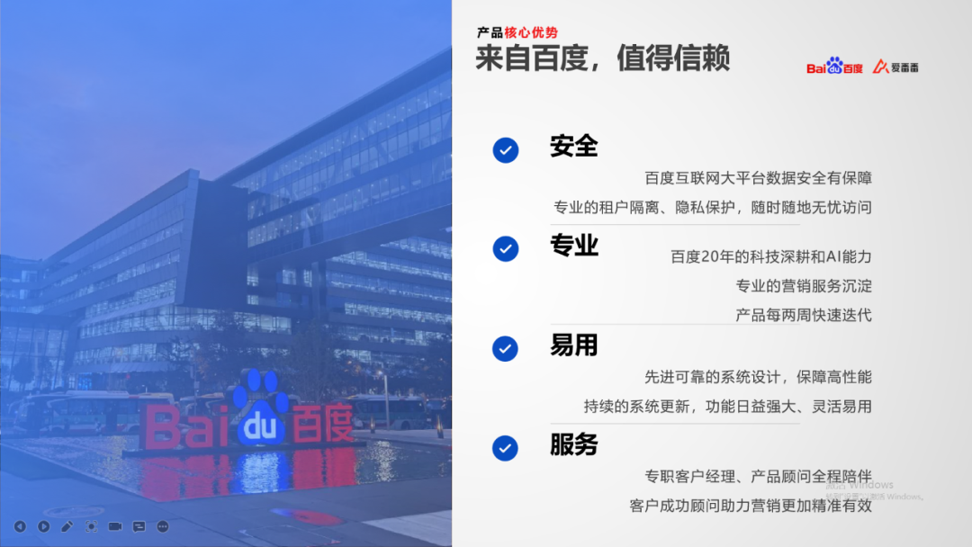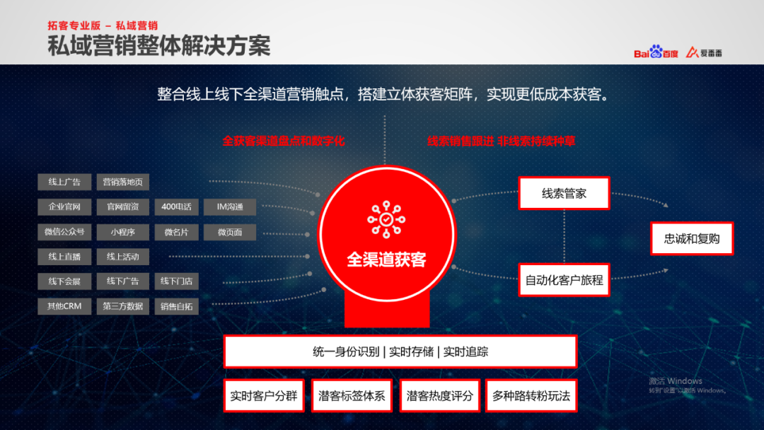 私域营销 自动旅程:自动旅程,千人千面营销,与潜客建立更高效的沟通渠道。 营销活动:营销活动,赋能多种营销场景,各渠道推广效果一目了然。 全员推广:全员推广,一人一码,实时打榜激励、推广效果好管理。 微信营销、CDP全渠道客户数据平台 公域营销 潜客定投:全面自动优化百度广告投放,帮您获得更多优质线索 企业和招投标查询:全方位企业信息查询,高效甄别生意,快速获取企业联系信息 爱番番企业名片:帮您优化公司名搜索结果,增强企业曝光