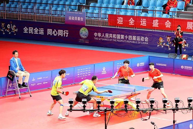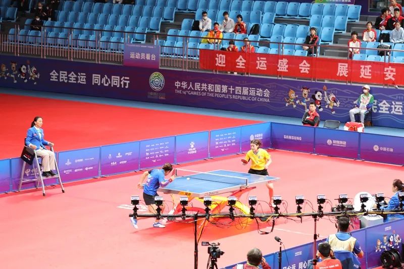 据悉,本次十四运会乒乓球赛共设置男团、女团、男单、女单、男双、女双、混双七个小项,产生7枚金牌,有来自全国各省、自治区、直辖市以及香港、澳门特别行政区的23支代表队共计189名运动员参赛。更值得一提的是,本次十四运会乒乓球比赛由陕煤集团冠名,作为十四运会的合作伙伴,陕煤集团还向十四运会组委会赞助1亿元,包括7000万元现金和3000万元实物,“禹龙”钢材和“枣悦”果汁成为十四运会官方指定品牌。当晚比赛开赛前,比赛现场还播放了陕煤集团宣传片,比赛前的热场中,为现场幸运观众赠送了“枣悦”果汁。