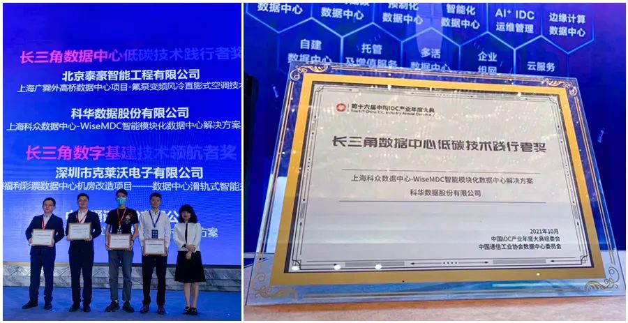 长三角数据中心低碳技术践行者 奖项 honor 在当天的颁奖典礼上,科华数据上海科众数据中心-WiseMDC智能模块化数据中心解决方案,被主办方授予“长三角数据中心低碳技术践行者”奖项。目前,该解决方案已成功应用于政府、金融、教育、医疗、运营商等行业。上海科众数据中心位于上海市北高新园区,基础设施建设标准按照国际Tier 3+设计。该数据中心提供了一个非常完善的冗余备份设计,具有不间断制冷和基础设施物理隔离等特点,PUE低于1.4。此外,上海科众数据中心通过了A类数据中心等级证书、信息系统安全三级保护证书,以及ISO 9001质量管理体系证书、ISO 20000 IT服务管理体系证书、ISO 27001信息安全管理体系证书等机房认证。