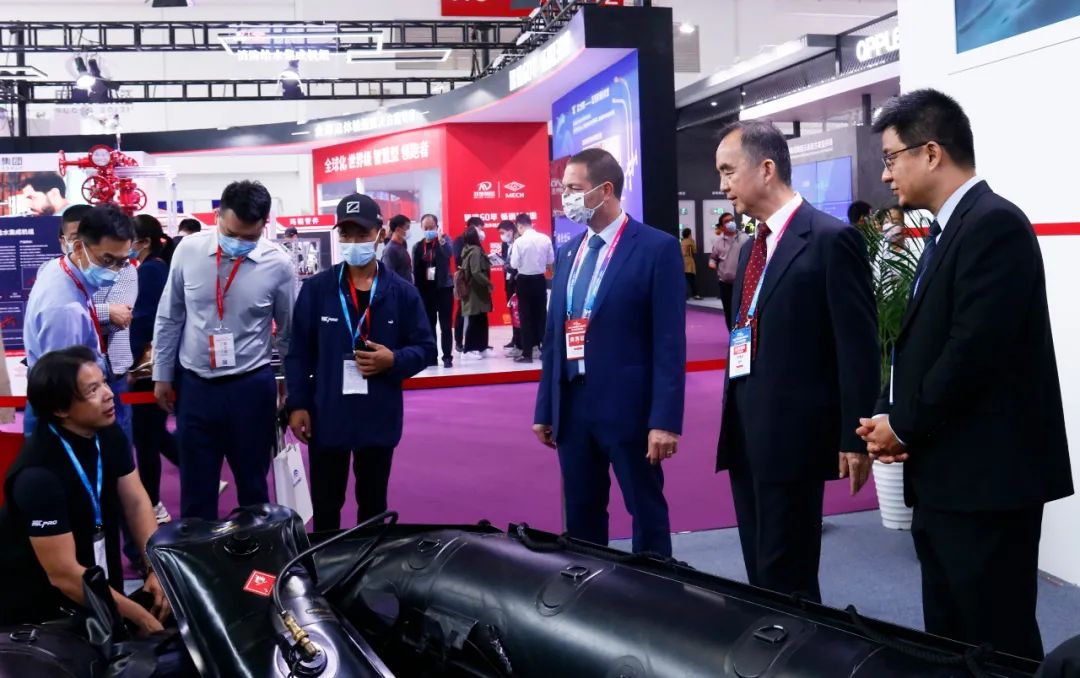 参展企业人员为陈伟明、莫兰等一行介绍消防救援艇的产品特点和优势