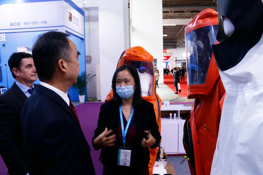 参展消防企业工作人员为陈伟明、驻华使馆代表等一行介绍消防救援防护服的产品特点和优势