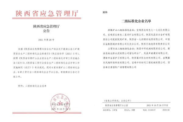 近日,陕煤地质所属天地地质公司和一九四公司被陕西省应急管理厅认定为“安全生产二级标准化企业”。(韩欣)