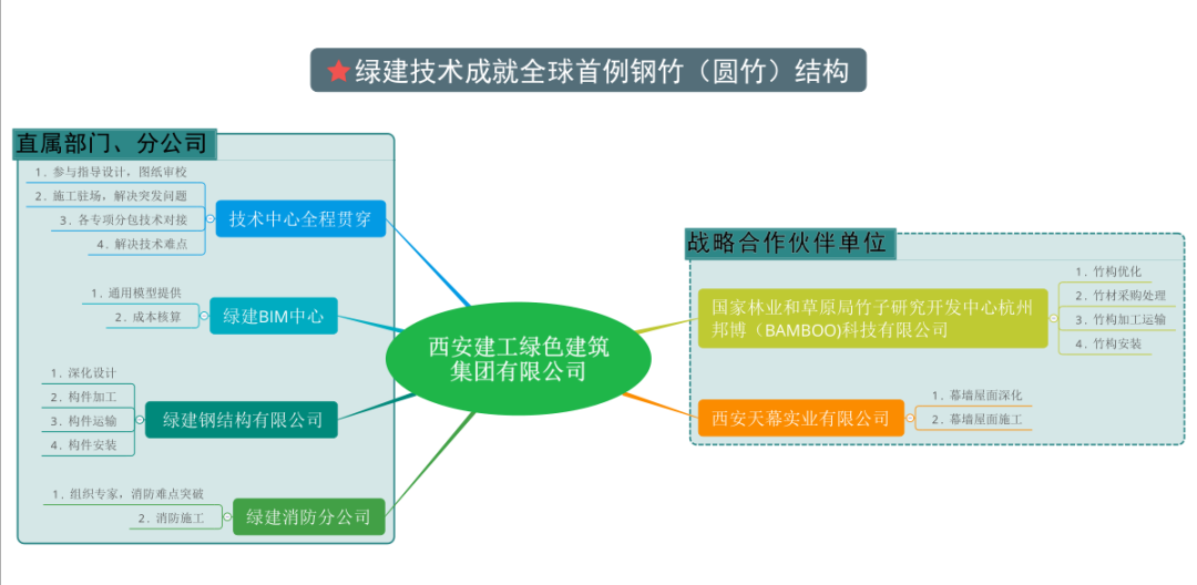 宜宾国际竹产品交易中心是世界上第一座钢竹(圆竹)混合结构的大型建筑,总建筑面积13012.42平方米,总投资1.5亿元。西安建工绿色建筑集团有限公司作为项目实际执行单位,集公司人力、物力、技术各项资源全力支持。针对项目难点及关键点,绿建集团技术中心、BIM中心,集团旗下的陕西绿建装配式工程有限公司、消防分公司,战略合作伙伴单位西安天幕实业有限公司、国家林业和草原局竹子研究开发中心、杭州邦博(BAMBOO)科技有限公司全力配合,深度沟通、反复探讨,每一个关键节点都留下了奋战的身影,全力推动项目顺利实施。