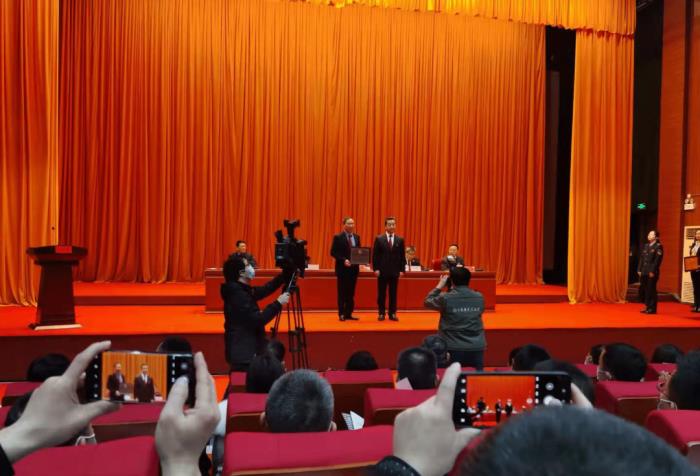 【企迪网讯 编辑/刘欣】于2022年2月19日上午召开的益阳市质量大会现场,湖南桃花江竹材科技股份有限公司荣获“益阳市市长质量奖”,桃花江竹材公司董事长薛志成先生代表上台领奖,益阳市市人民政府市长陈竞先生亲自为其颁奖。