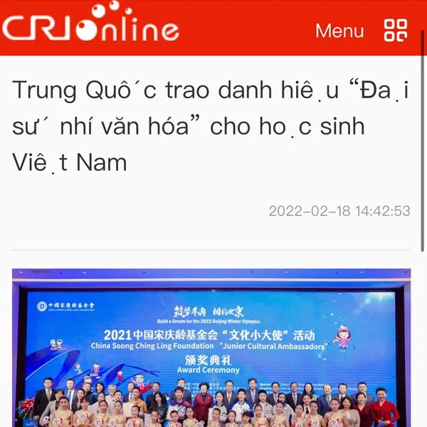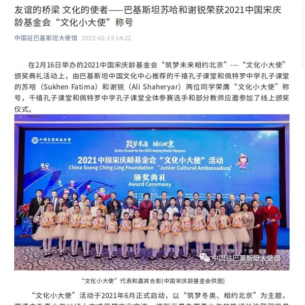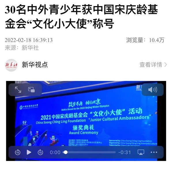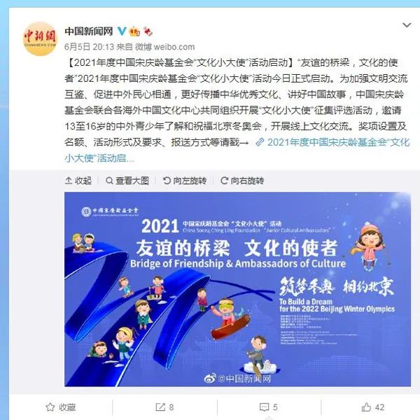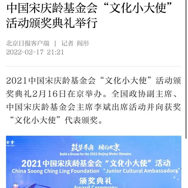 2021年度中国宋庆龄基金会“文化小大使”活动系首次举办,去年6月启动后得到国内外媒体广泛关注,活动期间国内外发布和转载的新闻报道总浏览量接近1亿次。2022年,中国宋庆龄基金会将继续举办“文化小大使”活动,诚挚希望继续得到大家的关心和支持。活动有关通知将择机发布,敬请关注!