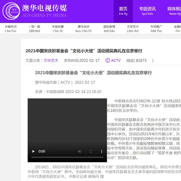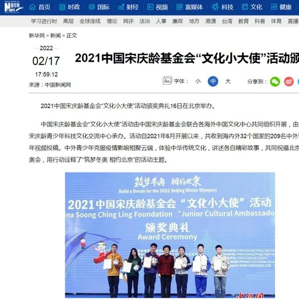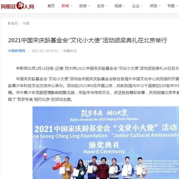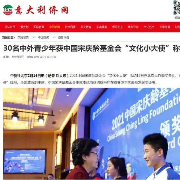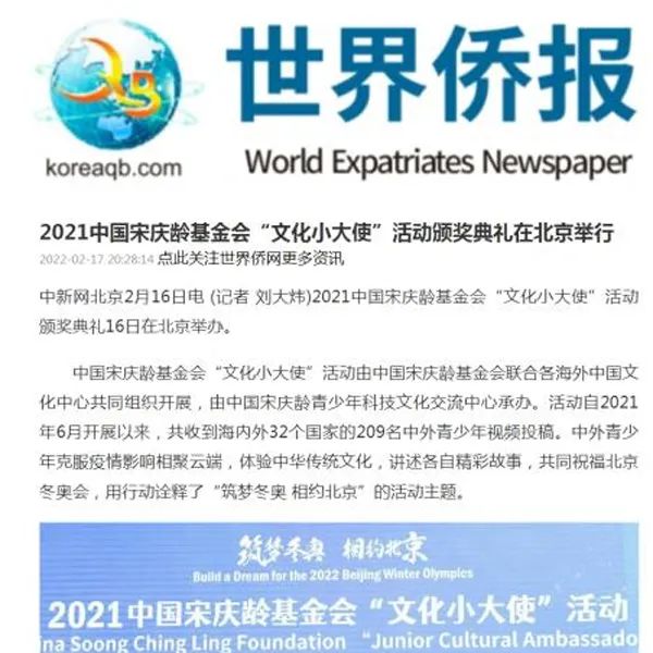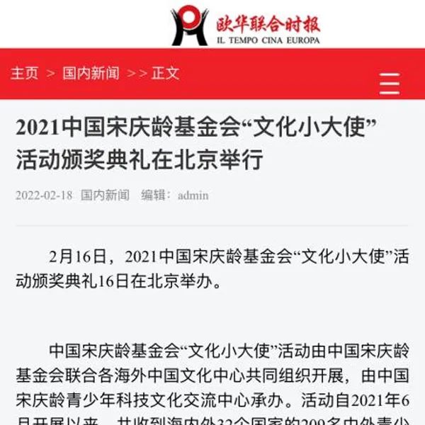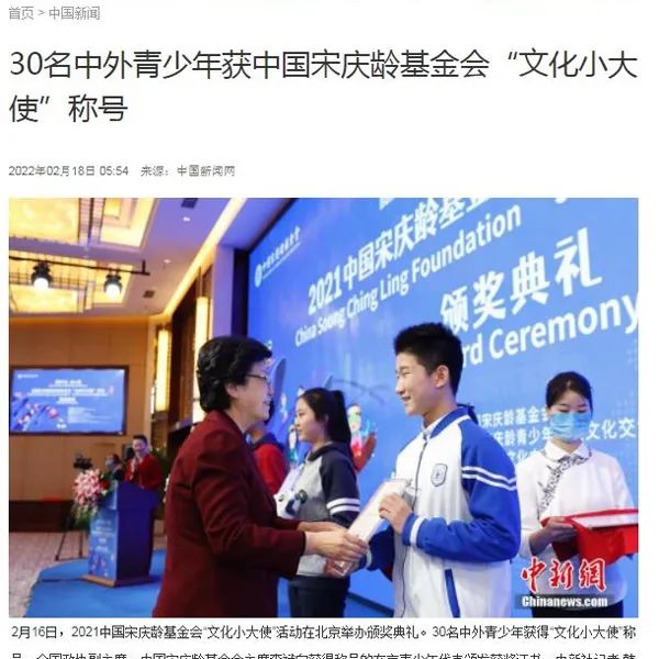 企迪网讯(编辑刘欣)由中国宋庆龄基金会联合各海外中国文化中心共同组织开展,中国宋庆龄青少年科技文化交流中心承办的2021中国宋庆龄基金会“文化小大使”活动颁奖典礼举行后,国内外媒体对“文化小大使”活动的关注报道又掀起一轮热潮。