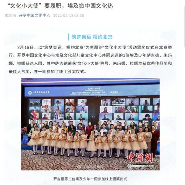在埃及,14岁少年萨吉德喜获“文化小大使”称号的消息迅速引发关注。埃及文化部长伊纳斯女士向获奖少年致信祝贺,称赞获奖萨吉德和另外两名埃及参赛者是“文化软实力的未来”,埃及文化部、青体部先后在社交媒体官方账号刊发贺词。我驻埃及大使廖力强在使馆为萨吉德等三位获奖青少年颁奖,鼓励他们发挥“文化使者”和“友谊桥梁”作用,为促进中埃两国文明交流互鉴、构筑两国友好关系的光明未来做出更大贡献。埃及40余家电视台、网络媒体和平面媒体争相采访获奖青少年并刊发相关消息,在当地引起热烈反响。在巴基斯坦,当地主流媒体刊发活动新闻稿20余篇,在社交媒体上得到大量报道转发,我驻巴基斯坦使馆、巴基斯坦佩特罗中学孔子课堂亦在网站上发布活动情况。开罗(埃及)中国文化中心、坦桑尼亚中国文化中心、河内(越南)中国文化中心、曼谷(泰国)中国文化中心、贝尔格莱德(塞尔维亚)中国文化中心等分别在本机构网站及推特、脸书、Ins等平台官方账号发布了活动相关消息。俄罗斯、美国、澳大利亚、阿根廷、菲律宾、韩国、荷兰、加拿大、匈牙利、意大利、日本、罗马尼亚、西班牙等国近30家华文媒体跟踪报道了本次活动。据不完全统计,近期海外报道总量已超过500篇次。