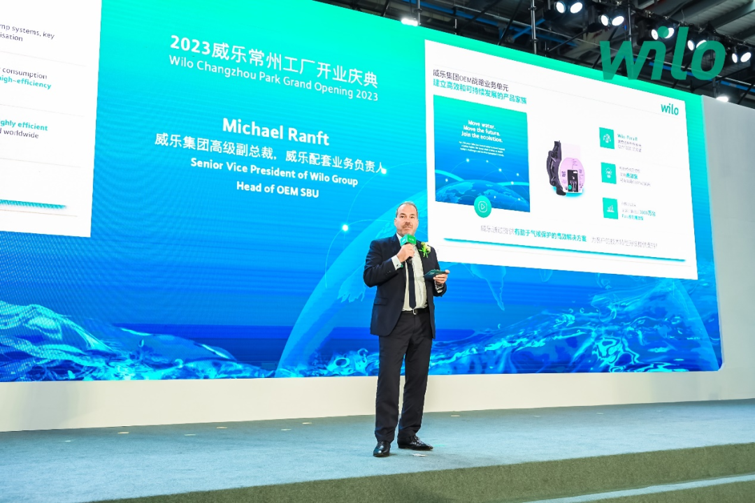 庆典现场,威乐集团董事会成员,首席技术官Georg Weber先生表示:“在中国常州,我们投建了水泵行业全球最现代化的工厂,工业4.0标准和数字化方案是常州工厂的基石,使我们能够实现雄心勃勃的可持续发展目标。” 威乐集团的企业战略源于与中国高度相关的国际大趋势:全球化2.0、城市化、能源短缺、水资源匮乏和气候变化,而数字化转型是所有五大趋势中的一个关键因素。威乐常州工厂中建立了国际上最先进的高效泵及电机生产线,以支持中国的双碳战略,并构建中国与世界的桥梁。