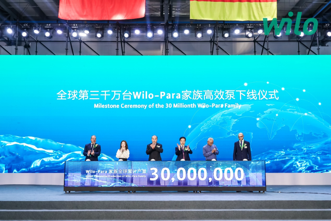 常州市人民政府秘书长周承涛先生、常州市新北区委书记周庆先生、德国驻上海总领事馆副总领事Lucas Meyer先生、中国德国商会上海执行董事马铭博先生、中国节能协会秘书长宋忠奎先生、中国制冷学会高级顾问、全国制冷标准化技术委员会主任委员孟庆国先生等政府及行业组织领导和威乐集团及中国管理层共同出席了盛大的庆典仪式,回顾企业如何伴随中国经济发展壮大,并共同见证了威乐常州工厂生产制造碳中和、全球第3,000万台Wilo-Para家族高效泵成功下线及系列战略合作签约。
