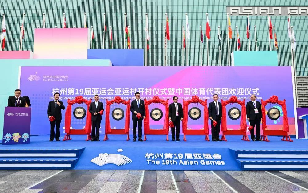 9月16日,杭州亚运会亚运村开村仪式暨中国体育代表团欢迎仪式在杭州亚运村旗帜广场举行。中国体育代表团副团长、国家体育总局副局长、中国奥委会副主席周进强,亚奥理事会代理总干事维诺德,杭州亚组委副主席、浙江省委常委、杭州市委书记刘捷,中国体育代表团团部代表、赛艇队、羽毛球队、田径队近两百人参加了活动。