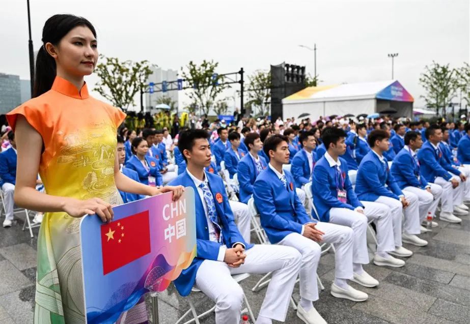 中国体育代表团作为杭州亚运会东道主,组成了1329人的代表团,其中运动员886人(女运动员437人,男运动员449人),将参加除卡巴迪、板球以外的38个大项、407个小项的比赛。中国体育代表团欢迎仪式上升起了鲜艳的五星红旗,奏响了《义勇军进行曲》。现场中国体育代表团、亚运村互赠送了礼物。(倪敏哲摄 刘诺制作)