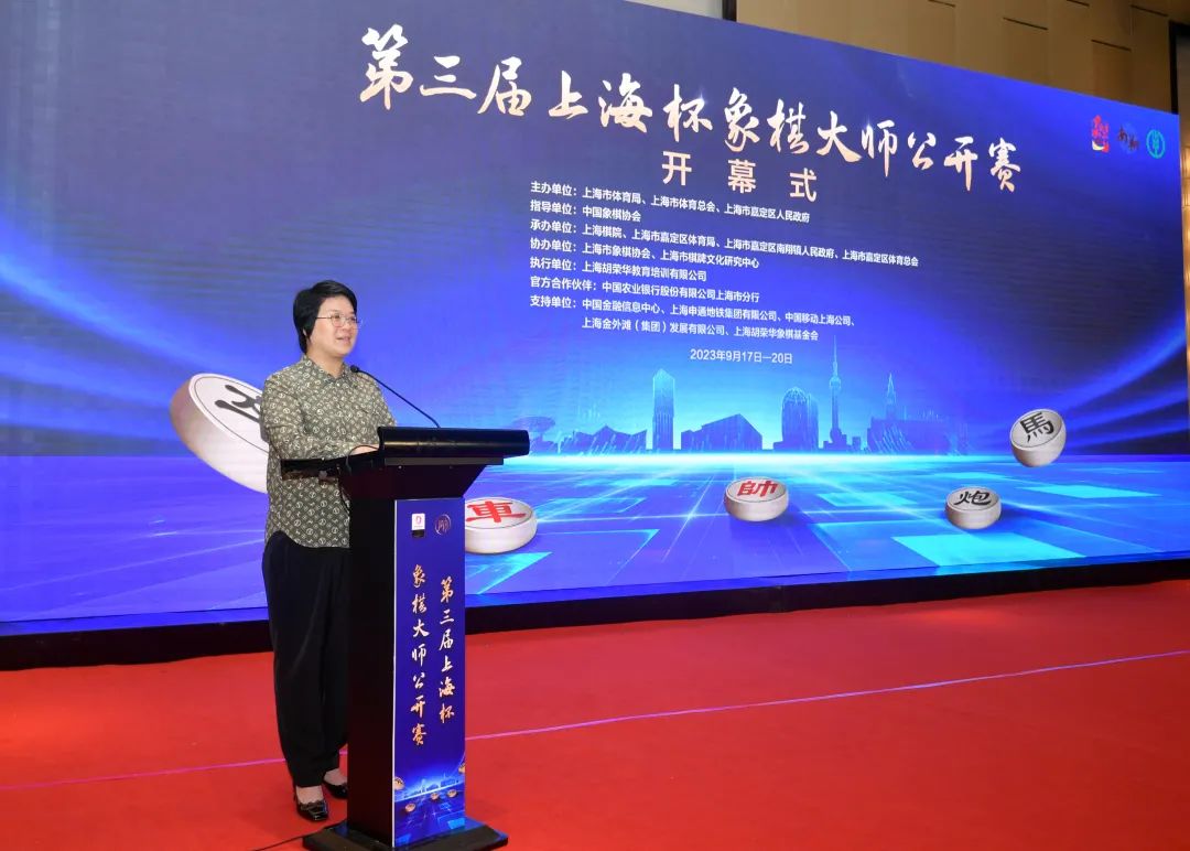 市体育局一级巡视员赵光圣宣布比赛开幕并开棋,嘉定区副区长汤东英致辞,中国农业银行上海市分行副行长张国兴出席仪式。