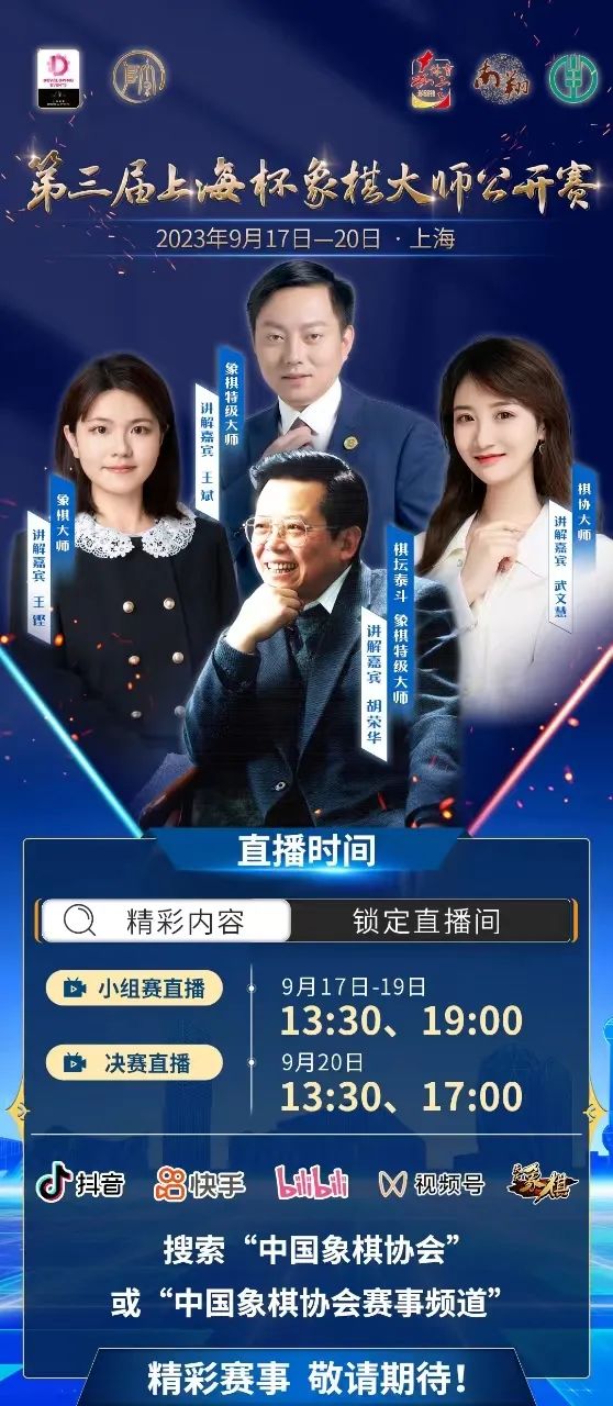 9月17-20日,关注视频号@中国象棋协会、快手@中国象棋协会赛事频道、抖音@中国象棋协会,收看第三届上海杯精彩赛事直播。