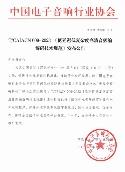 2023年9月19日,由中国电子音响行业协会(CAIA)和中国电子技术标准化研究院联合主办的2023 GAS音频技术峰会在北京盛大召开。本次峰会以“新技术、新应用、新发展”为主题,正式发布了全球首个统一架构、全码率无线音频编解码标准L2HC,标志着国内高清无线音频产业进入新的里程碑。