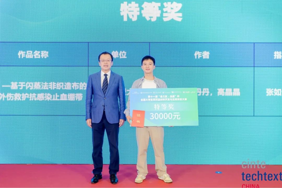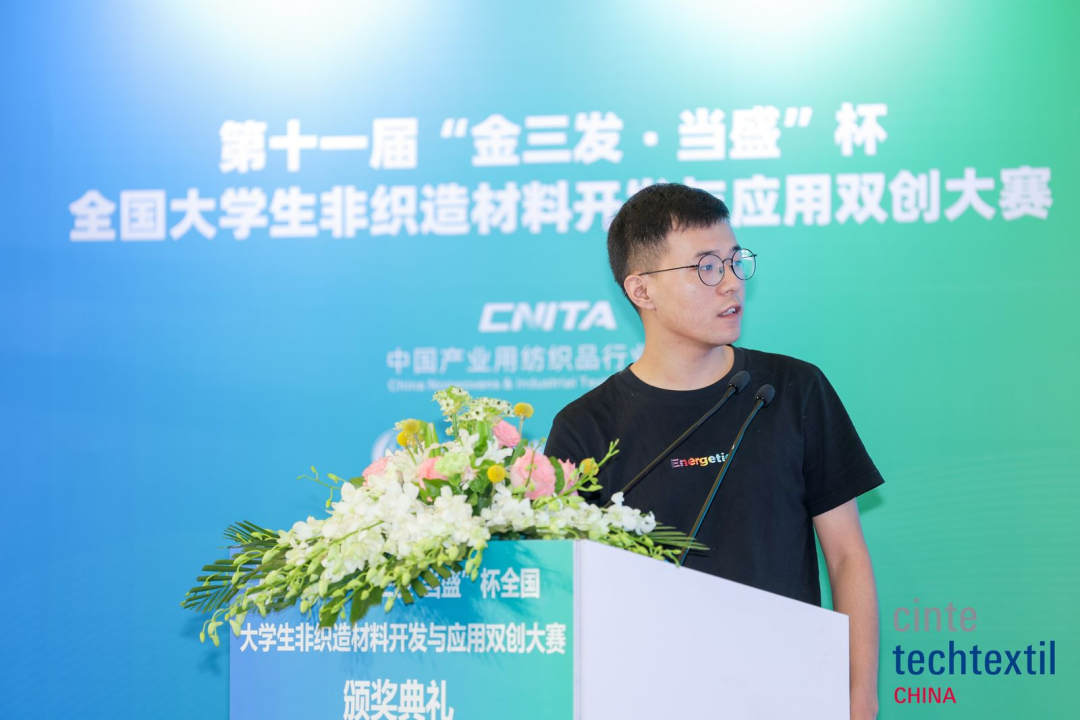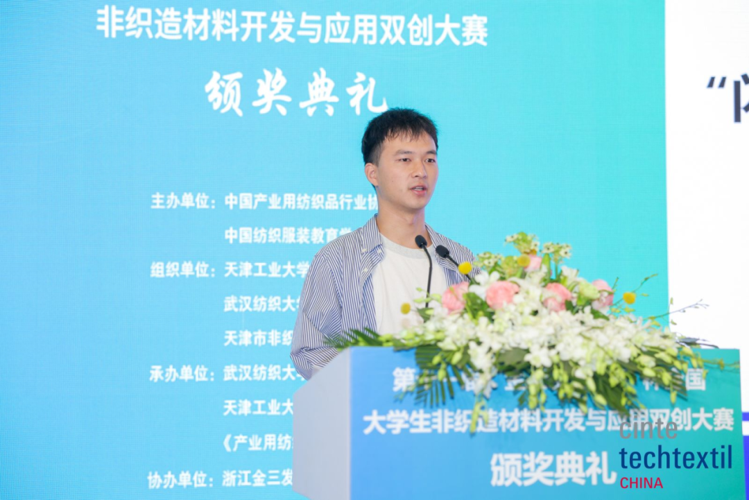 浙江金三发集团有限公司董事长助理严峻在致辞中表示,大学生是国家的未来,是创新的希望。从2013年开始,金三发连续11年不遗余力协办及赞助全国大学生非织造材料开发与应用大奖赛。如今大赛已成为非织造材料专业的一项经典赛事,有力推动了专业人才培养。希望通过赛事平台,发掘优秀非织造产品设计开发人才,激发更多创新创造活力。