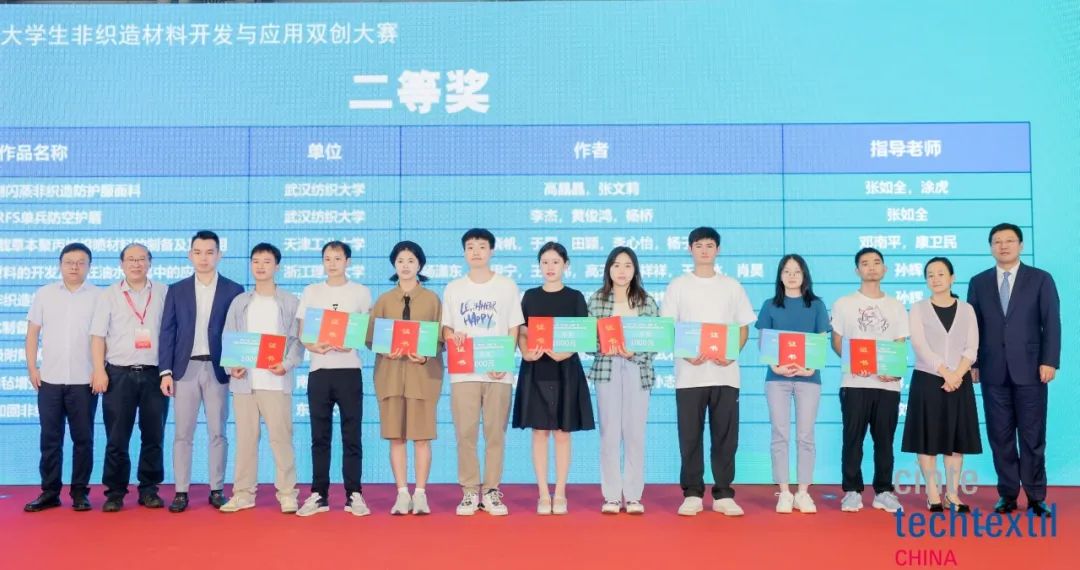 中国纺织工业联合会副会长李陵申,中国纺织服装教育学会会长倪阳生,中国国际贸促会纺织行业分会常务副会长梁鹏程,中国产业用纺织品行业协会会长李桂梅,浙江金三发集团有限公司董事长助理严峻,厦门当盛新材料有限公司副总经理刘爽,教育部高等学校纺织类专业教学指导委员会非织造材料与工程分委会主任、天津工业大学教授钱晓明,武汉纺织大学纺织科学与工程学院院长、教授蔡光明,南通大学教授张瑜,上海大学教授任慕苏等领导嘉宾,以及本届大赛获奖学生、各参赛高校的教师、学生代表出席颁奖典礼。会议由天津工业大学教授封严主持。