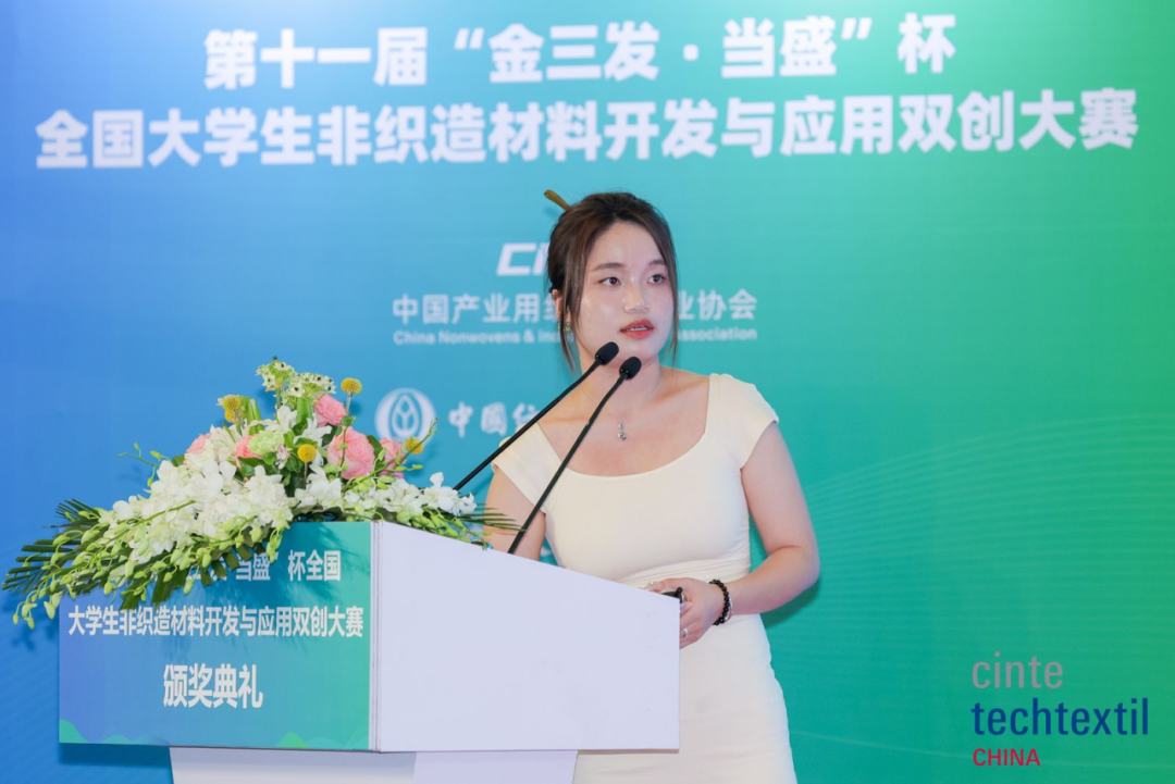 厦门当盛新材料有限公司副总经理刘爽致辞表示,非织造材料领域有着广阔的市场空间和无限的可能性,在这样的背景下,我们以赛事鼓励参赛选手们积极探索、不断创新,为行业注入新的活力与动力。通过大赛的举办挖掘更多的优秀人才,并给予他们必要的支持和关注,这是当盛新材参与大赛的初衷。