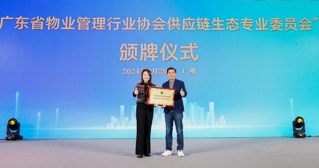 随后进行了“广东省物业管理行业协会供应链生态专业委员会”颁牌仪式,广东省物业管理行业协会常务副会长李长江为广东省物业管理行业协会供应链生态专业委员会主任夏凌旭颁牌。