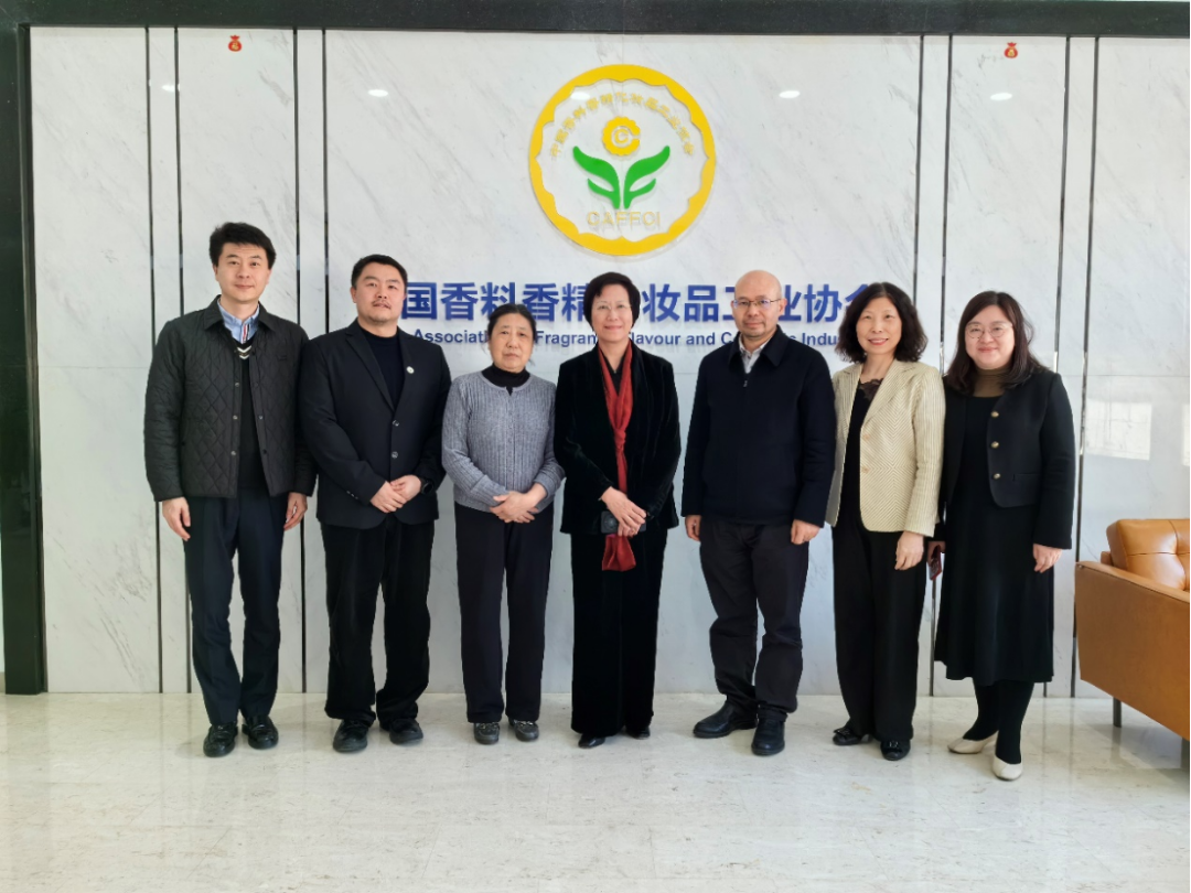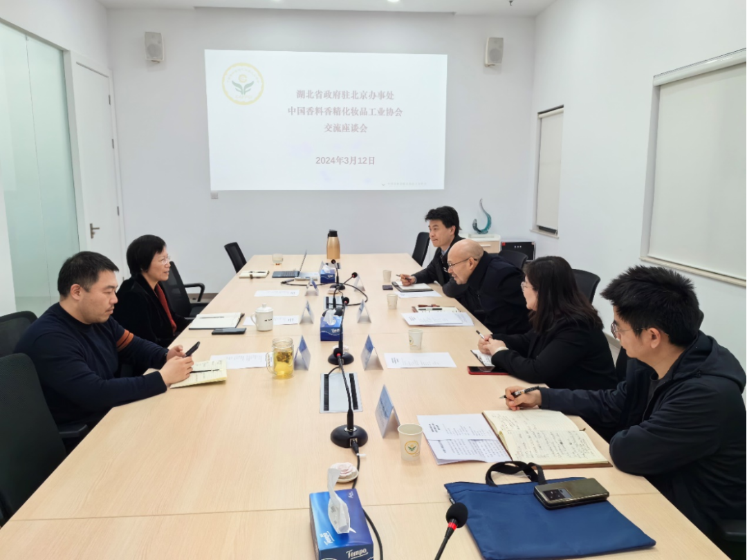 3月14日下午,湖北省政府驻北京办事处(以下简称“湖北驻京办”)副主任付道轩、联络处处长尹蕾、北京湖北企业商会秘书长刘宏泉、联络处一级主任科员吴懿杰等一行到访中国香料香精化妆品工业协会(以下简称“中国香化协会”)交流工作。中国香化协会理事长颜江瑛、秘书长穆旻、办公室主任李英参加了交流。