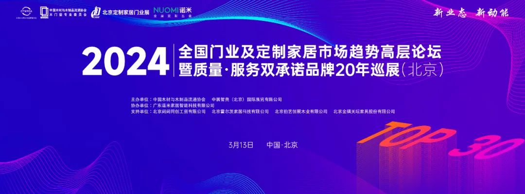 2024年3月13日,由中国木材与木制品流通协会与中展智奥(北京)国际展览有限公司共同主办,广东诺米家居智能科技有限公司协办,北京闼闼同创工贸有限公司、北京霍尔茨家居科技有限公司、北京伯艺创展木业有限公司、北京金隅天坛家具股份有限公司共同支持的“2024全国门业及定制家居市场趋势高层论坛暨质量·服务双承诺品牌20年巡展活动”在北京成功召开。