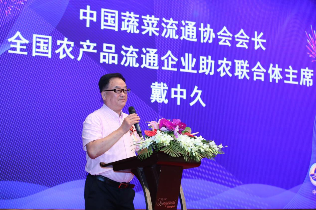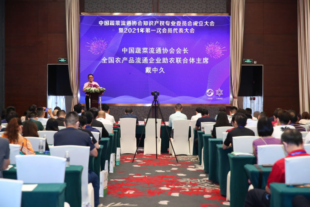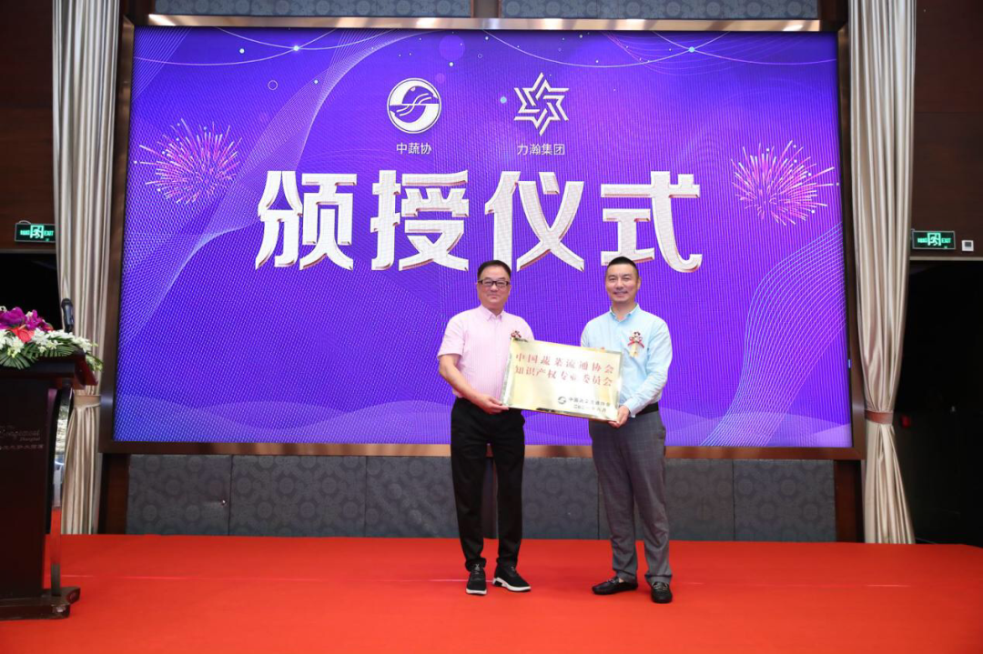 中国蔬菜流通协会会长戴中久,对中国蔬菜流通协会知识产权专业委员会进行授牌,知识产权专业委员会会长段宏伟作为代表接受了授牌。